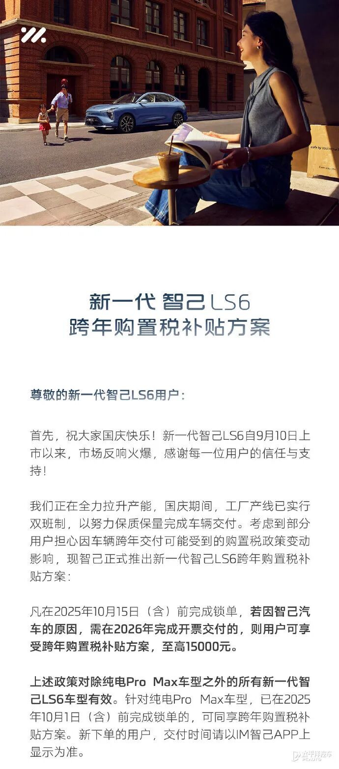 上述政策对除纯电Pro Max车型之外的所有新一代智己LS6车型有效。针对纯电Pro Max车型,已在2025年10月1日前完成锁单的,可同享跨年购置税补贴方案。