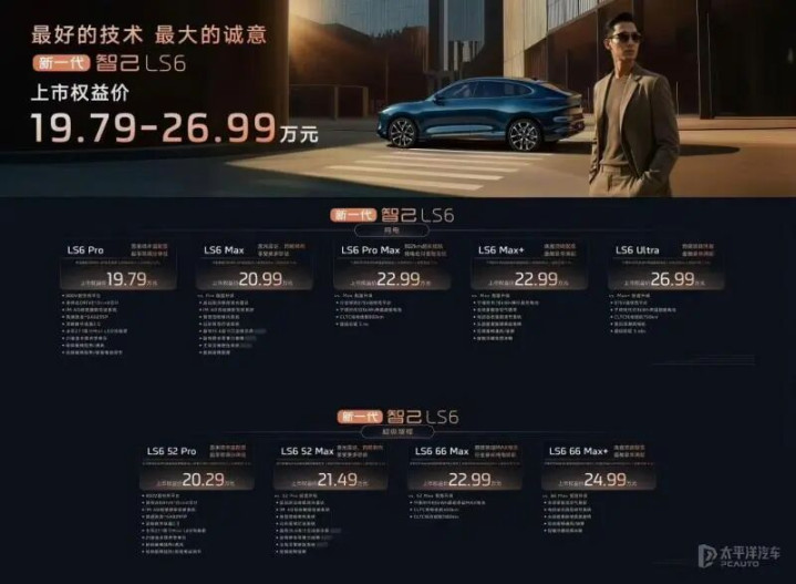 9月10日,全新智己LS6正式上市,纯电版共推出5款车型,售价为19.79-26.99万元,增程版共推出4款车型,售价为20.29-24.99万元。